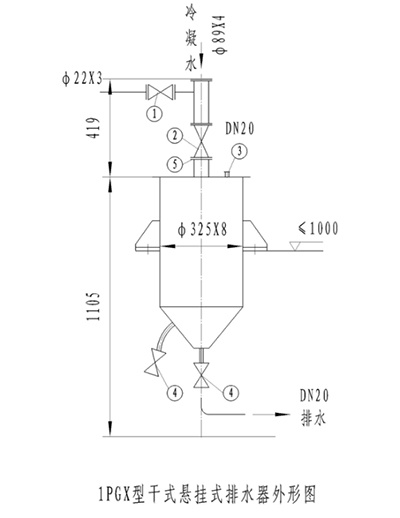 3、當(dāng)排水器檢修時(shí),應(yīng)先閉閥門(mén)②,打開(kāi)管堵③,插上盲板⑤,放掉冷凝水,即可檢修。