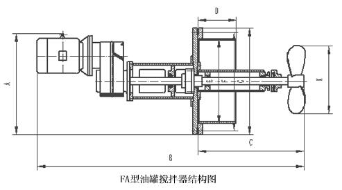 側(cè)向伸入式攪拌機是由儲罐的側(cè)壁伸入罐內(nèi),它通過法蘭蓋與罐體的開口法蘭相聯(lián)結(jié)。攪拌機的槳葉為船用螺旋槳型。由于螺旋槳的轉(zhuǎn)動,使罐內(nèi)液體產(chǎn)生兩個方向的運動,一個沿著螺旋槳軸線方向向前運動,另一個沿螺旋槳圓周方向的運動。軸線方向的運動,由于受到罐壁的阻礙而使罐內(nèi)液體沿著罐壁作圓周方向的運動,而液體沿螺旋槳圓周方向的運動,就使罐內(nèi)液體上下翻動,這樣就使罐內(nèi)液體得到攪拌,并可防止罐內(nèi)沉積物的堆積。