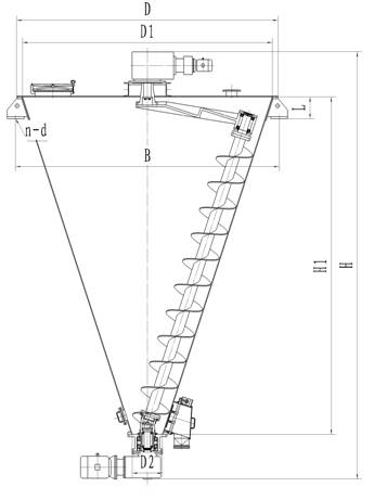 本機主要由錐型筒體、螺旋軸、公轉(zhuǎn)傳動臂、自轉(zhuǎn)轉(zhuǎn)動頭及出料閥組成。物料由上部加入。上部減速機帶動公轉(zhuǎn)傳動臂使螺旋軸在筒體內(nèi)作公轉(zhuǎn)運動。下部減速機帶動螺旋軸作自轉(zhuǎn)運動,由于兩軸相交成一定角度,中間使用特制的萬向聯(lián)軸節(jié)傳動。