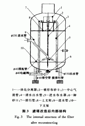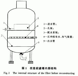 污水站采用的過濾裝置為普通平流濾塔(高4 m,直徑2.3 In),改造前濾塔內部結構見圖1。該濾塔采用雙層濾料,上層為石英砂,下層為水淬渣,反沖洗方式采用大阻力配水系統(tǒng)氣水聯(lián)合反沖洗。平流濾塔存在的問題:①反沖洗采用大阻力配水系統(tǒng),每天反沖洗15n1in,消耗大量水資源和電能;② 在傳統(tǒng)的常壓反沖洗系統(tǒng)中,存在著反沖洗不徹底、濾料需要定期更換的問題。