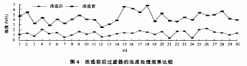 改造后過濾器和未改造過濾器運行30 d的出水濁度數(shù)據(jù)見圖4。