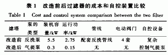 由表1可見,改造后的連續(xù)動態(tài)過濾器與改造前的普通過濾器相比,其裝機容量大幅降低,折合到24 h進行比較,其運行功率減少了50%,反沖洗自控裝置簡化。因此連續(xù)動態(tài)過濾器的設備成本和運行成本均優(yōu)于普通過濾器,而且操作簡單,運行安全。