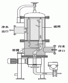 轉(zhuǎn)臂式自清洗過濾器是一種集約化的過濾器,多個(gè)濾筒安裝于一個(gè)過濾器筒體內(nèi),結(jié)構(gòu)緊湊。轉(zhuǎn)臂式自清洗過濾器用于去除低粘度介質(zhì)中的固體顆粒。需過濾的介質(zhì)從內(nèi)向外流過過濾器的楔形網(wǎng)濾筒,固體顆粒截留在濾筒內(nèi)側(cè)。隨著污染物的增多,過濾器污染側(cè)和清潔側(cè)之間的壓差增大。若壓差達(dá)到設(shè)置的觸發(fā)壓差便開始自動(dòng)反沖洗。反沖洗時(shí).齒輪電動(dòng)機(jī)轉(zhuǎn)動(dòng)欲清洗濾筒下面的沖洗臂,進(jìn)入反沖洗狀態(tài)的濾筒的原料液流被中斷。反沖洗閥開啟,濾液側(cè)和反沖洗管路之間的壓降把一小部分濾液逆向沖入欲清洗的濾筒。聚積在濾筒內(nèi)側(cè)的污染顆粒物被松開并通過沖洗臂沖進(jìn)反沖洗管路。每個(gè)濾筒的反沖洗時(shí)間一過,反沖洗閥立即關(guān)閉。這樣所有濾筒被依次清洗。所有濾筒都被清洗后,反沖洗循環(huán)結(jié)束。轉(zhuǎn)臂式自清洗過濾器可以用來除去工業(yè)用水和海水中的固體雜質(zhì)。轉(zhuǎn)臂式自清洗過濾器常用于保護(hù)重要設(shè)備,如冷卻系統(tǒng)、化學(xué)和水處理裝置等。圖3為轉(zhuǎn)臂式自清洗過濾器結(jié)構(gòu)示意圖。
