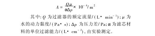 過濾器的工作能力取決于濾芯的有效過濾面積、濾芯本身的性能、水的粘度、過濾器壓差及水中固體顆粒的含量。過濾器進(jìn)出口壓差越大,阻力越小時(shí),過濾器的過濾能力越大。水流通過濾芯的速度越低,表面壓力越小,則過濾精度越高。過濾器的設(shè)計(jì)主要根據(jù)工作壓力和過濾精度的要求選擇濾芯材料,按所要求的流量及選擇的濾芯材料來計(jì)算過濾面積。過濾器的有效過濾面積[4]
